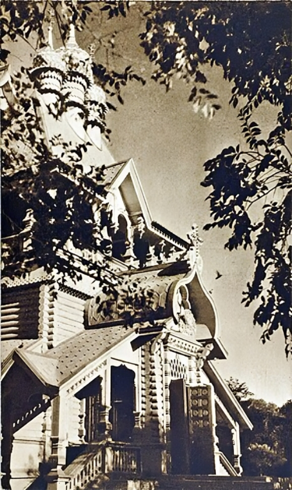 一条小路通往庄园的主建筑——圣尼古拉教堂。路边是一片白桦林。白桦可是俄罗斯重要的文化符号哦!雾中,圣尼古拉教堂露出了神秘的背影,在台阶上仰视她,厚重的木纹,精美的雕刻。不禁遥想,当年的圣尼古拉教堂该是何等的风姿?可惜在动乱的文革时期被毁。 教堂的大钟被拆下后运往五大连池市凤凰山农场,巡回的教堂文物直到2002年,大钟才被运回哈尔滨,现存于东北烈士纪念馆。尼古拉大钟底部直径840厘米,重约300公斤。于1866年在俄国秋明市制造,1900年圣尼古拉教堂竣工后开始悬挂,至1966年因教堂遭到破坏而不知去向。后来这口大钟在一个农场被发现,成为尼古拉教堂目前发现的唯一文物。