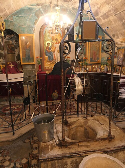 主在第六时辰来到息哈尔,祂因旅途劳顿,感到累了,就停下来休息。当门徒们前去买吃的东西时,有一个撒玛黎雅妇人前来汲水。耶稣向这妇人要水喝,她感到惊奇,说犹太人是不会向撒玛黎雅人要东西的,因为她从主的口音和衣着上看出祂不是撒玛黎雅人。但是,主却告诉了她更高超的东西,祂谈到了属灵之水,这水是充裕的,能洁净人,因为圣神总是被比作水和火。但这妇人却断定主没有这样的水,因为祂没有打水的器具,这井又深,她就这样对主说了。之后,她进而谈到他们的祖先雅各伯,说是雅各伯挖了这井,也在这井里汲水饮用,他的子孙也是这样,以此表明这井里的水是充裕的,并且这水也是非常清凉的。为了不吓到妇人,主并没有明白地说出自己比雅各伯更大,却再次回到水的话题上来,说水是一切事物中最重要的,凡喝了祂所拥有之水的人,永不再渴。