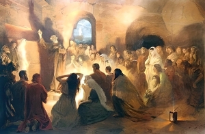 Перевод:Когда сошел Ты к смерти, Жизнь бессмертная, тогда ад умертвил Ты сиянием Божества. Когда же Ты и умерших из преисподней воскресил, все Силы Небесные взывали: «Податель жизни, Христе Боже наш, слава Тебе!»