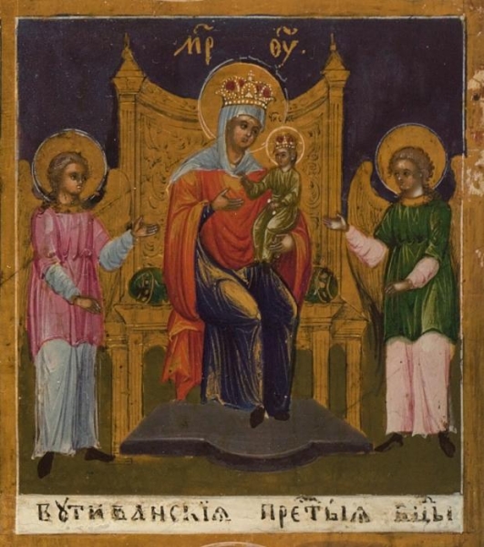Сведений о месте и времени явления чудотворной Вутиванской иконы Божией Матери не сохранилось. Изображение в основном известно по гравюрам и иконам XVIII–XIX вв.: Богоматерь сидит на троне, Младенец в короне с левой стороны; 2 ангела (иногда без крыльев), указывающие на Них, предстоят по сторонам престола. Существуют варианты изображения Младенца: с прижатой к груди ладонью правой руки и благословляющей именословно правой рукой или со свитком в левой руке.