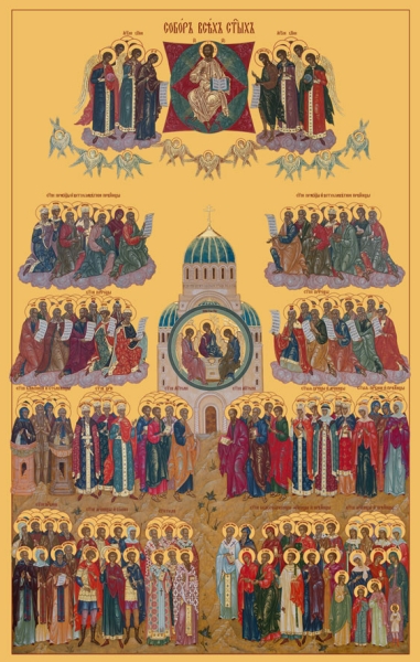 О, преблаже́ннии уго́дницы Бо́жии, вси святи́и, предстоя́щии Престо́лу Пресвяты́я Тро́ицы и наслажда́ющиися неизрече́ннаго блаже́нства! Се ны́не, в день о́бщаго ва́шего торжества́, ми́лостивно призрите на нас, ме́ньших бра́тий ва́ших, принося́щих вам сие́ хвале́бное пе́ние и хода́тайством ва́шим прося́щих ми́лости и отпуще́ния грехо́в у Преблага́го Го́спода: ве́мы бо, вои́стинну ве́мы, я́ко вся, ели́ка восхо́щете, испроси́ти у Него́ мо́жете. Те́мже у́бо смире́нно мо́лимся вам: моли́те ми́лостиваго Влады́ку, да пода́ст нам дух ва́шея ре́вности к хране́нию святы́х Его́ за́поведей, я́ко да те́кше по стопа́м ва́шим, возмо́жем земно́е по́прище в доброде́тельном житии́ без поро́ка прейти́ и в покая́нии дости́гнути пресла́вных селе́ний ра́йских, и та́мо ку́пно с ва́ми прославля́ти Отца́ и Сы́на и Свята́го Ду́ха, во ве́ки веко́в. Ами́нь.