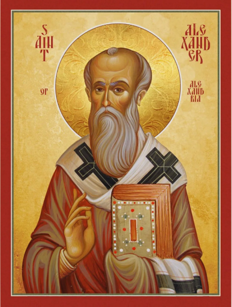 Святитель Александр, патриарх Александрийский[1], был главным защитником православной веры, которому суждено было вести борьбу с еретиком Арием. Святитель Александр управлял Александрийской церковью с 313 по 326 годы. Жизнь святителя пришлась на трудный период в истории Церкви, когда необходимо было защищать православное вероисповедание от ереси Ария. Стремясь сохранить единство православной церкви, святитель Александр со всей решимостью поднялся на борьбу за истину. В многочисленных письменных посланиях и беседах он обличал лжеучение и заблуждение самого ересиарха и его сторонников. Видя непримиримость Ария, святитель созвал Поместный Собор (около 320 года), на котором ересь Ария и его сообщников была осуждена, а сами они отлучены от Церкви. Однако Арий продолжал сеять раздор в Александрийской и других Церквах. На состоявшемся в 325 году I Вселенском Соборе в Никее святитель Александр был одним из главных участников. Собор осудил и предал анафеме ересь Ария. Деятельность святителя Александра, мужественного защитника апостольских догматов, способствовала сохранению истинности христианского учения о Святой Троице. Блаженная кончина святителя последовала в 326 году.