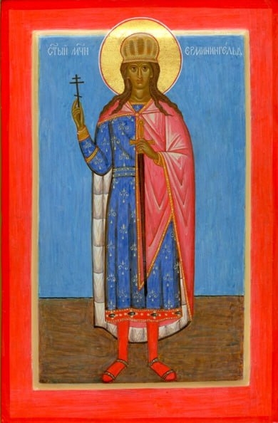 Св. мученик Ерминингельд, царевич Готфский, принял мученическую смерть в 586 году. Оставив арианскую ересь, он обратился в православие, несмотря на уговоры и угрозы своего отца-арианина, короля Лувингильда. За отказ вернуться к прежней вере отец приказал казнить сына.