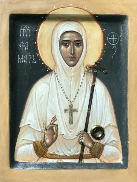 Яко крин благоуханный,/ посреде пустыни безбожия/ в земном Отечестве твоем процвела еси,/ преподобныя мати Фамарь,/ и подвиги воздержания исповеданием веры украсивши,/ востекла еси к Небесному Жениху Христу,// Иже увенча тя красотою славы нетленныя.