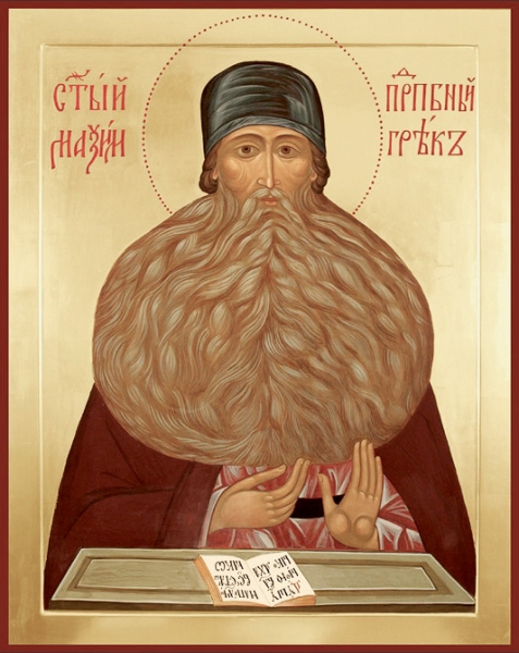 Прп. Максим Грек (XV–XVI в.) ‒ выдающийся богослов и переводчик, уроженец Греции. Получив блестящее образование в Европе, принял монашество на Афоне. В 1518 г. по просьбе великого князя Василия III прибыл в Москву для перевода богослужебных книг. За критику церковных и политических злоупотреблений (включая развод князя) был осуждён, 20 лет провёл в заточении. Несмотря на гонения, продолжал литературную деятельность, создав около 365 сочинений. Канонизирован в 1988 г. Мощи обретены в 1996 г. в Троице-Сергиевой Лавре, где почивают ныне.