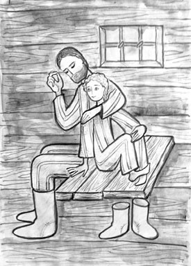 Первое горе, поразившее сердце Гриши, — смерть их соседа дяди Семена, который очень любил общаться с мальчиком, часто чтото рассказывал, вырезал ему из дерева забавных медвежат и зайчиков. Тетя Катя, его жена, всегда старалась угостить Гришу чемнибудь вкусным.