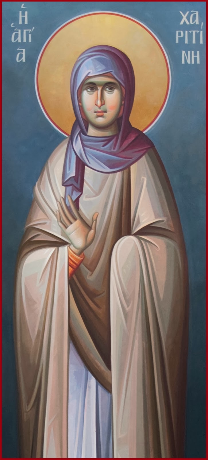 Крепким разумом, Харити́но,/ душу утве́рждши верою,/ бори́теля врага я́ве посрами́ла еси́,/ у Христа́ предста́, всеблаженная,/ червлени́цу от крове́й твои́х нося́щи,/ и при́сно со А́нгелы ра́дуешися,/ моли́ за ны, страстоте́рпице.