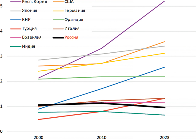 Россия принадлежит к числу очень и очень немногих стран со снижающейся численностью исследователей и уже покинула мировой тop-5 по этому показателю. По словам аналитика, падение численности исследователей в РФ – это «отражение процесса выравнивания обеспеченности рабочего места исследователя». В 2000 году эта обеспеченность рабочего места исследователя была одной из наименьших среди технологически развитых стран (на уровне Румынии). Сейчас эта обеспеченность поднялась примерно до показателей Польши и Индии. Здесь речь идет о связанных показателях: чем ниже общая численность исследователей, тем в теории оказывается выше средняя обеспеченность каждого рабочего места у оставшихся исследователей.