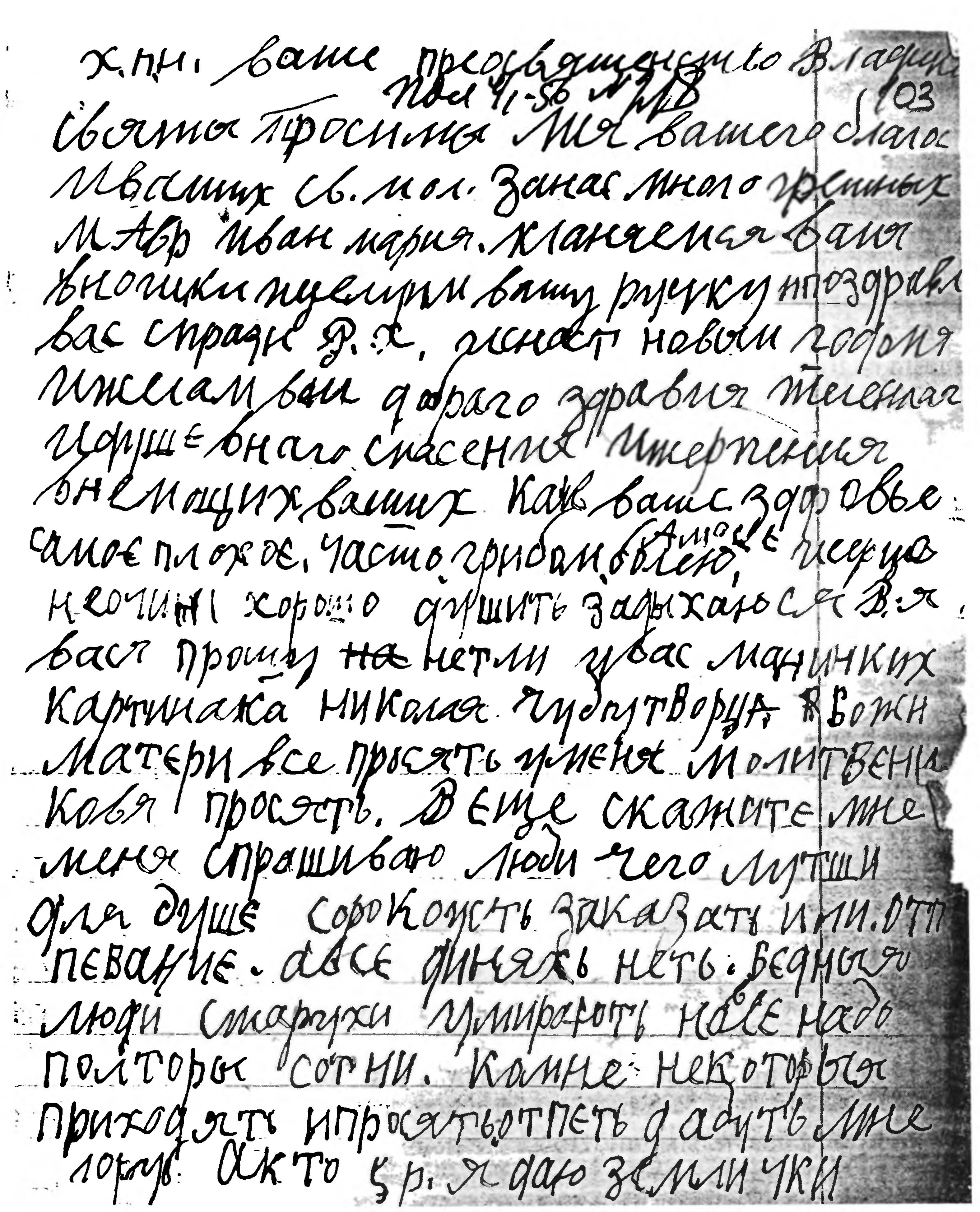 Х[ристос] п[осреди] н[ас]. Ваше Преосвященство Владыко святый. Просим мы вашего благословения и ваших св[ятых] мол[итв] за нас, многогрешных, – м. Авр[амия] Иван, Мария. Кланяемся Вам в ножки и целуем Вашу ручку и поздравляем вас с праздн[иком] Р[ождества] Х[ристова] и с наст[упающим] новым годом и желаем Вам добраго здравия телесного и душевного спасения и терпения в немощах Ваших. Как Ваше здоровье, а мое самое плохое, часто гриппом болею, и сердце не очень хорошо, душит, задыхаюся. В[ладыко], я Вас прошу, нет ли у Вас маленьких картинок Николая Чудотворца, Божией Матери. Все просят, у меня молитвенников просят. В[ладыка], еще скажите мне, меня спрашивают люди, чего лучше для души, сорокоуст заказать или отпевание. А все денег нет, бедные люди. Старухи умирают, на все надо полторы сотни. Ко мне некоторые приходят и просят отпеть, дадут мне 10 руб[лей]. А кто 5 [рублей], я даю землички, рукописание, сама пишу его, у меня есть требник, и венчик рисую, крестик и «Святый Боже» пишу. <...> отец Александр меня научил, он ко мне ходил каждый год, нас, старух, причастить на ночь придет, а сейчас трудно вызвать священника – привези, увези, лошадь не дают. В[ладыка], прости меня, я стала нетерпеливая, надоело мне такой хворой жить. Машу я заманила ко мне, хотя, Спаси Боже, ходит ко мне, все дела делает. Простите меня Х[риста] р[ади] и благословите меня, помолитеся за меня. Будьте хранимы Богом. Ваша молитвенница м[ать] Авр[амия].