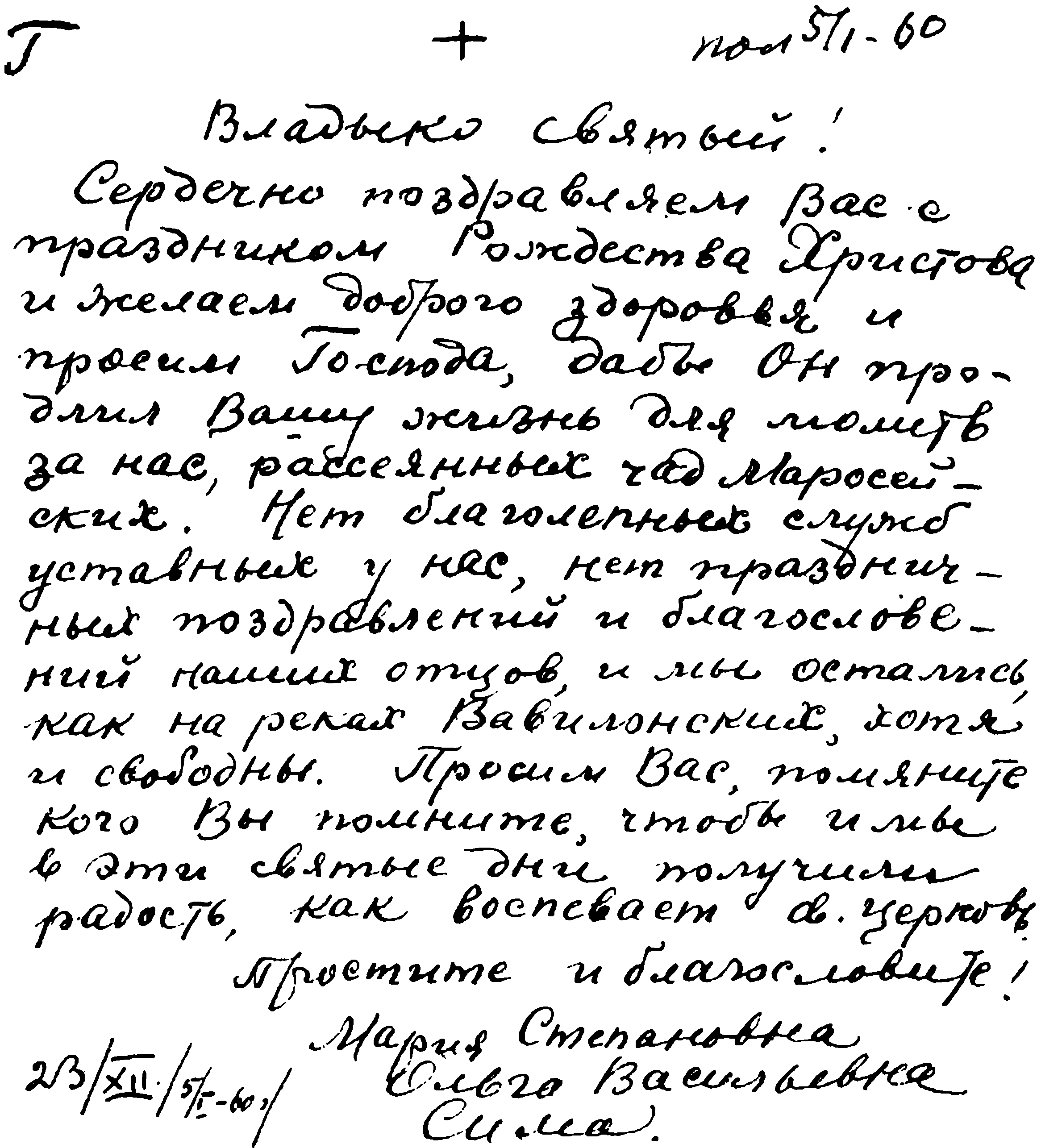 Сердечно поздравляем Вас с праздником Рождества Христова и желаем доброго здоровья и просим Господа, дабы Он продлил Вашу жизнь для молитв за нас, рассеянных чад Маросейских. Нет благолепных служб уставных у нас, нет праздничных поздравлений и благословений наших отцов, и мы остались, как на реках Вавилонских, хотя и свободны. Просим Вас, помяните, кого Вы помните, чтобы и мы в эти святые дни получили радость, как воспевает св[ятая] Церковь.