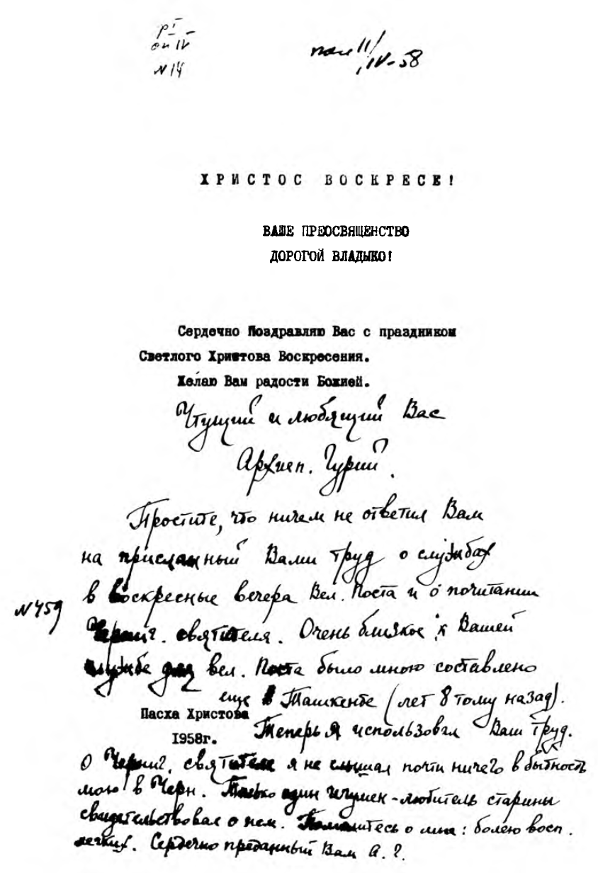 Письмо архиепископа Гурия (Егорова) к святителю Афанасию. Пасха 1958 г.