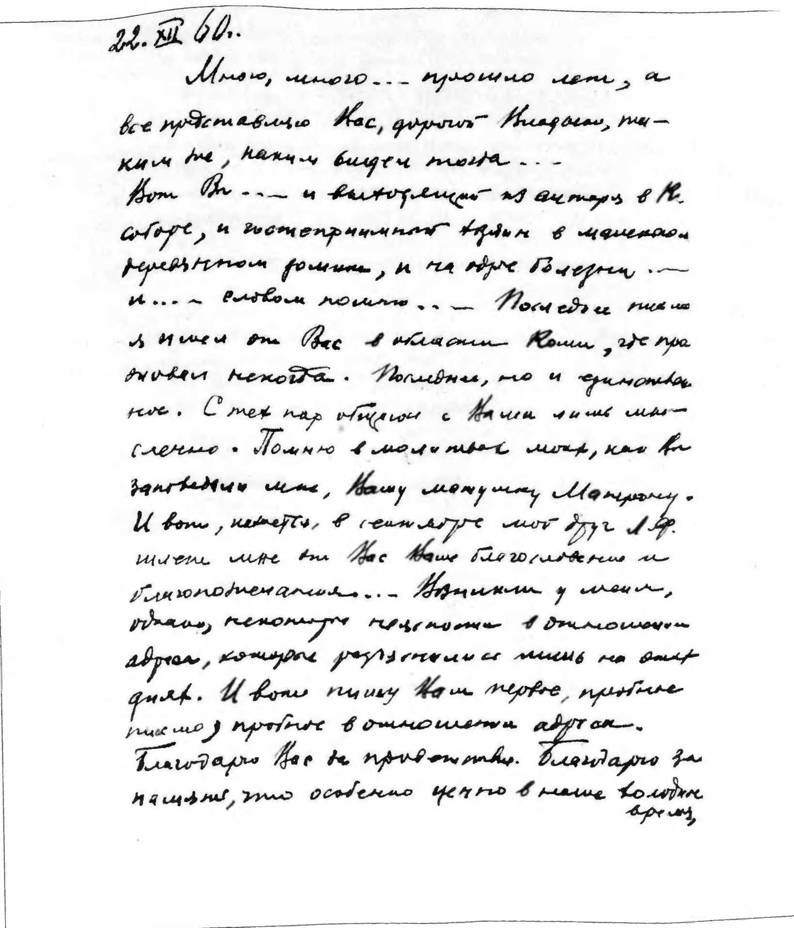 Вот Вы... и выходящий из алтаря в К[овровском?] соборе, и гостеприимный хозяин в маленьком деревянном домике, и на одре болезни, – и... словом, помню... Последнее письмо я имел от Вас в области Коми, где проживал некогда. Последнее, но и единственное. С тех пор общаюсь с Вами лишь мысленно. Помню в молитвах моих, как Вы заповедали мне, Вашу матушку Матрону. И вот, кажется, в сентябре мои друг Л. Ф.3 шлет мне от Вас Ваше благословение и благопожелания... Возникли у меня, однако, некоторые неясности в отношении адреса, которые разъяснились лишь на этих днях. И вот пишу Вам первое, пробное письмо, пробное в отношении адреса.