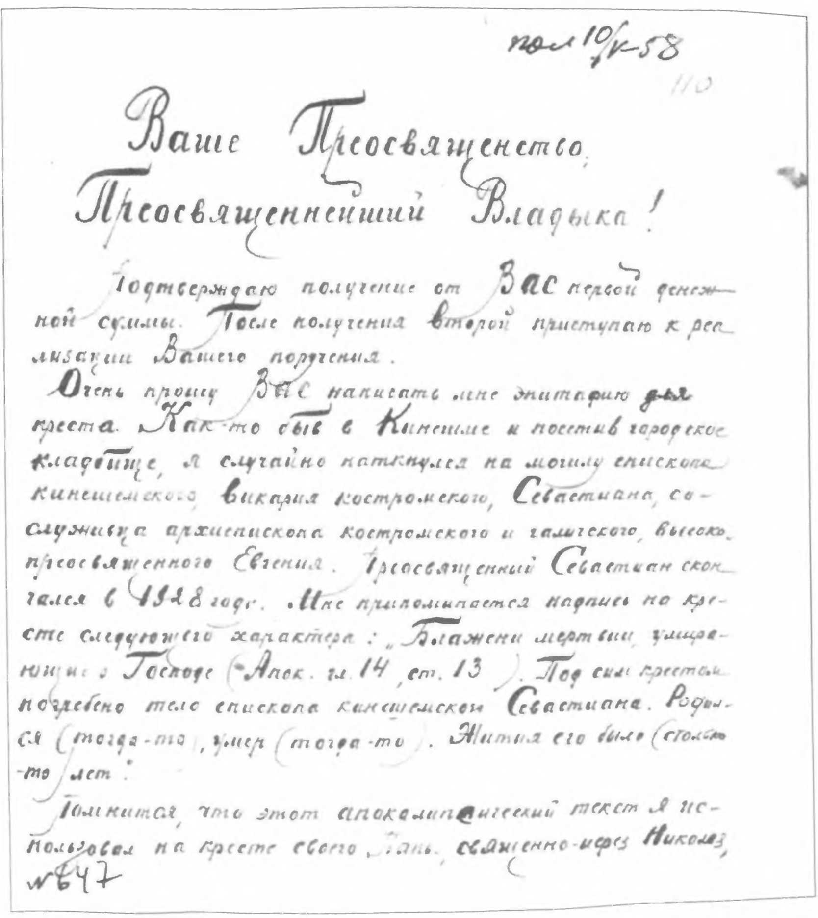 Я оч[ень] рад, боголюбивый Владыка, что Вы живы, и потому оч[ень] приятно получать от Вас весточки хотя бы к знаменательным датам.
