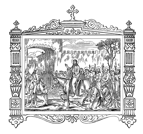 Время страданий Его приближалось. Господь отправился в Иерусалим на праздник Пасхи, и множество иудеев, узнав, что Он идет, вышли к Нему навстречу с пальмовыми ветками в руках. Приближаясь к селению Виффагия, к горе Елеонской, Господь сказал двум ученикам Своим: «Идите в селение, которое прямо перед вами. Там вы увидите привязанную ослицу и с нею осленка, на которого еще никто не садился; отвязавши, приведите Мне их. Если кто у вас спросит, для чего вы отвязываете их, то скажите, что они надобны Господу» (Мф. 21:2–3). Ученики исполнили веленное, привели ослицу и осленка и покрыли их своими одеждами. Господь, сев на осленка, продолжал путь Свой в Иерусалим. Так исполнились слова пророка Захарии: «Радуйся зело, дщи Сионя, проповедуй, дщи Иерусалимля! Се Царь твой грядет тебе, праведен и спасаяй; той кроток, и всед на подъяремника и жребца юна» (Зах. 9:9).