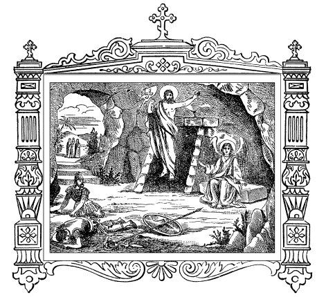Вскоре после того Иисус Христос, преданный иудеям, был распят на кресте и положен во гроб. Иудеи, знавшие, что Он говорил ученикам о воскресении Своем, опасались, как бы они не украли ночью тела Его и не сказали бы, что Он воскрес. Чтобы воспрепятствовать этому, они завалили камнем дверь гроба, приложили к нему печать и приставили сторожей. Но все эти предосторожности оказались тщетными и только более доказали истину воскресения Иисуса Христа. В ночь на третий день началось вдруг землетрясение, и ангел Божий отвалил камень от двери гроба. Ангел был как молния, и одежда его была бела как снег; сторожа содрогнулись от ужаса и пали как мертвые.