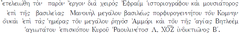 Алтарь образует верхнюю часть крестной фигуры храма, с закругленными оконечностями. Иконостас состоит из аркад. Главный алтарь, возвышенный на несколько ступеней, посвящен Рождеству Христову и принадлежит грекам; направо и налево от алтаря, против сходов в вертеп, устроены два престола: первый посвящен Обрезанию Спасителя, а второй трем волхвам. Мозаики на стенах главного алтаря во многих местах хорошо сбереглись. Все изображения взяты из Нового Завета и из истории церковных соборов. Из предметов Нового Завета более сбереглись: Благовещенье, Рождество, Вход в Иерусалим, Принесение Иисуса Христа во храм, Преображение и Вознесение; возле картины Введения замечательны остатки греческой надписи, которая определяет эпоху мозаической работы. Я следую выписке и переводу Кварезмия с его поправками: «Совершен сей труд живописцем и мозаическим художником Ефремом, в царствование великого Императора Эммануила Порфирородного Комнина, и во дни великого Короля Иерусалимского Аммория, и святейшего Епископа Вифлеемского Раулинета, в *677 году Индикта 2-го». Но тут видимая ошибка в списке числа, вероятно от выпадшего мозаика. Емануил I Комнин вступил на престол в 1143 году, и так мозаические украшения имеют без малого 700 лет давности. Вот подлинная надпись: