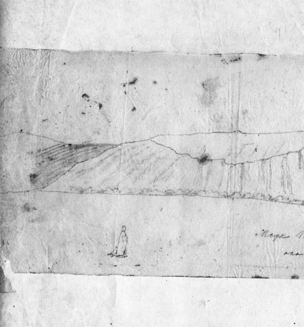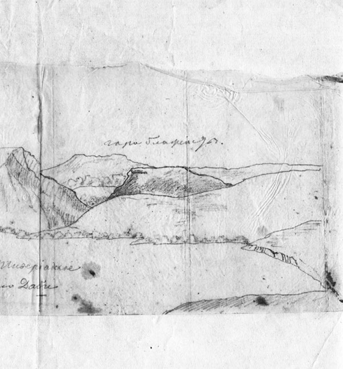 Мы ехали по совершенно запустелым полям, поросшим тернием, но почва их – чернозем. Через 25 минут от поворота, когда мы несколько поднялись, вдруг открылся богатейший ландшафт: – На ближнем плане является в виде трапезы гора Хиттинская, называемая со времен Иисуса горою Блаженств, в воспоминание Божественного поучения, произнесенного на ней Спасителем к собранному вокруг него народу: « Блаженны нищие духом, ибо их есть царствие небесное!» За нею выходит как бы из-под земли, углом, черное темя обрывистой скалы Тивериадского берега, а далее блистает часть Тивериадского озера; в конце горизонта расстилается увенчанный снегом Эрмон, примыкающий к цепи других гор Анти-Ливана. Я срисовал этот вид.