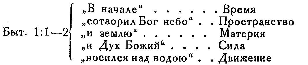 Ф. X. Капрон совсем недавно гениально показал, что первые страницы Библии находятся в гармонии со всеми последующими данными науки. Это сделано им в связи с учением Герберта Спенсера, великого мыслителя своего века, но, увы, атеиста (агностик), и потому ни в какой мере не склонного подтверждать истинность Писания. Рассуждая о том, что он называет «проявлением непознаваемого», под чем, он, очевидно, разумеет Божественные силы в мироздании, Герберт Спенсер утверждает, что эти проявления должны на базисе науки иметь пять определенных форм, которые он именует так: пространство, время, материя, движение, сила.