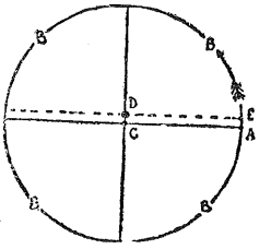 Таким образом, выходит, что в «первый день» земля, очевидно, двинулась с точки (А) вдоль по своей орбите (В) вокруг определенного центра (С); солнце же было «поставлено» на «четвертый день», но не точно в центре орбиты, а в положение (Д), противоположное положению земли (Е), которого она достигла на «четвертый день». (См. чертеж).