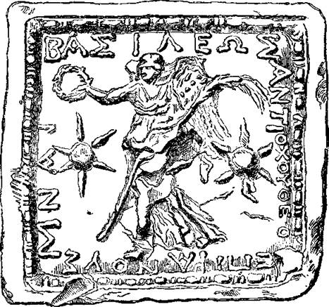 3Цар.10:17; Иез.45:12; 1Ездр.2:69; Неем.7:71,72; 1Макк.14:24; 15:18. У св. Луки, 19:13–25, мина есть название монеты; см. n° 170, 4. Замечательна мина времен Маккавеев, по своему рисунку. Кругом нее читаем: ΒΑΣΙΛΕΩΣ ANTIOXOY ΘΕΟΥ ЕПИФА ΝΟΥΣ MNА (мина царя Антиоха божественного Епифана). Виктория (богиня победы), стоя между двумя звездами, держит в правой руке венок, а в левой – пальму. (См. рис. 17). Мина легкого веса, весит 516 грамм. См. J. Brandis, Münzwesen, in-8°, Берлин, 1866, стр. 158.