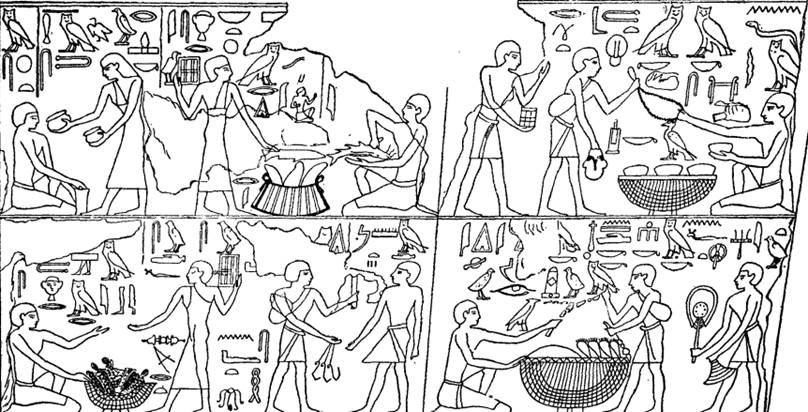 Сл. Ис.55:1. На колоннах одной гробницы V-й династии (ранее эпохи Авраама) изображен египетский рынок. См. рис. 20. В верхнем ряду, в первой сцене направо, сидит торговец пред большой корзиной, поставленной на подпорке и заключающей три вазы. Иероглифы передают нам разговор продавца и покупателя. „Вот тебе сат сладкого напитка“, говорит первый второму. Этот последний, держа в правой руке пару сандалий, отвечает ему: „вот тебе прочные сандалии“. Подходит второй покупатель, неся в правой руке небольшой сундук. – В следующей сцене представлены женщина, продавщица рыб, и мужчина, изготовляющий одну рыбу; верша, поставленная пред ним, заключает четыре других рыбы. Нокупательница несет на своем плече четырехугольный ларец, который заключает то, что она хочет дать в обмен продавцу. – В нижнем ряду, направо, два покупателя стоят у большой корзины, наполненной овощами. „Дай посмотреть, дай замену“ (вознаграждение), говорит продавец первому покупателю, который держит в левой руке мешок, и в обмен представляет продавцу из правой руки связку стеклянного товара; другая связка такого же товара находится у него в левой руке. Второй покупатель покупает овощи в обмен на веер, который он держит в правой руке; в левой руке он держит кочергу для печи. – Ниже, в следующей сцене, мы видим двух людей, вступающих в разговоры: один держит три удочки в правой руке. Женщина, которая следует за ним, несет на плече ящик и готовится делать покупки у продавца платьев. Сл. Maspero, Gazette archéologique, t. VI, 1880, p. 97.