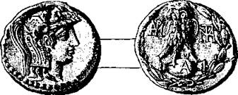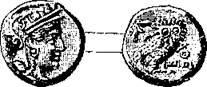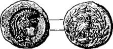 Лицевая сторона дидрахмы: голова Паллады в шлеме, смотрящая вправо. – На обороте: ночная сова в четырехугольном дупле, два масличных листа; надпись: АѲЕ.