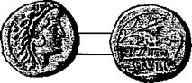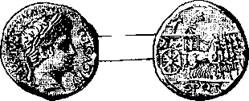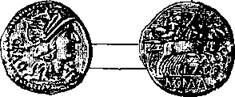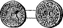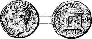 Бронзовый ассарий (см. рис. 34) с лицевой стороны представляет лучезарную голову Августа влево и надпись: DIVUS. AUGUSTUS. PATER. – Ha обороте изображен алтарь, надпись: IMP. Т. VESP. AUG. REST. Imperator Titus Vespasianus Augustus restituit. Ha полях S. C. (Senatus consulto)