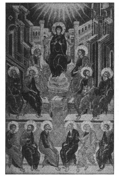 В день великого праздника, Пятидесятницы, Богоматерь со всеми учениками находилась в Сионской горнице и готовилась тёплыми молитвами к принятию обещанного Утешителя. Внезапно в третий час дня послышался в воздухе сильный шум, как бы во время бури, и наполнил дом, в котором они находились, и явились им как бы огненные языки и почили на каждом из присутствовавших, и все исполнились Духа Святого. Это произошло в десятый день по вознесении Господа Иисуса.