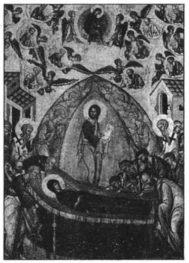 Настал третий день после архангельского благовестия. Приближался третий час дня, когда архангелом предвозвещено было успение Богоматери. В доме горело множество свечей; апостолы славословили Господа, окружая одр, на котором возлежала Пречистая Матерь Его; Она молилась в ожидании кончины Своей. Внезапно отверзся покров дома, и свет Божественной славы осенил всех присутствовавших. Все ужаснулись: в лучах небесного света все земное померкло. Сам Царь славы, Христос, окружённый сонмами небесных сил и праведных душ, явился Своей Пресвятой Матери. Обрадованная лицезрением Сына и Бога Своего, Она возгласила слова боговдохновенной песни: «Величит душа Моя Господа, и возрадовася дух Мой о Бозе Спасе Моем: яко призре на смирение Рабы Своея» – и, приподнявшись с одра, поклонилась Своему Господу и услышала Божественный призыв: «Прииди, ближняя Моя, прииди, возлюбленная, и вниди в обители вечной жизни». Пречистая Богородица повторила молитву Свою: «Приими дух Мой с миром и огради Меня от области темной». Господь успокоил Её: тёмные силы змия уже попраны ногами Её, и Она призывалась с дерзновением перейти от земли на небо. Радостно