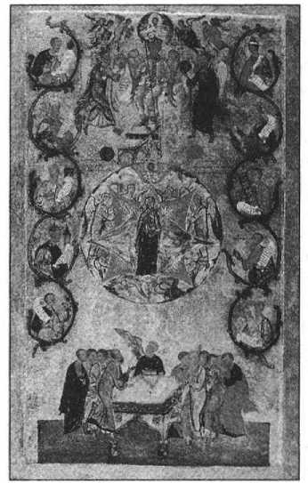 Икона «Похвала Богородице с изображением Явления Богоматери апостолам в преломлении хлеба», начало XVII в.
