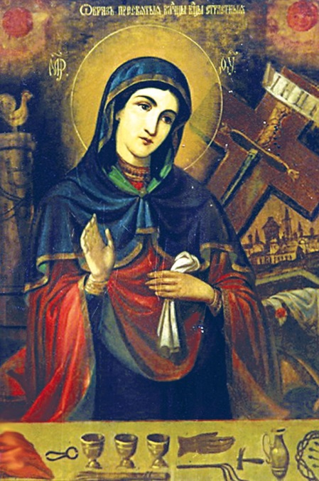 Все эти иконы – верные снимки с древней чудотворной иконы, находящейся в Страстном монастыре в Москве. Название Страстной эта икона получила оттого, что около лика Богородицы изображены в облаках два ангела с орудиями страстей Христовых, а Богомладенец Иисус изображён как бы в страхе припадающим к плечу Пречистой Матери.