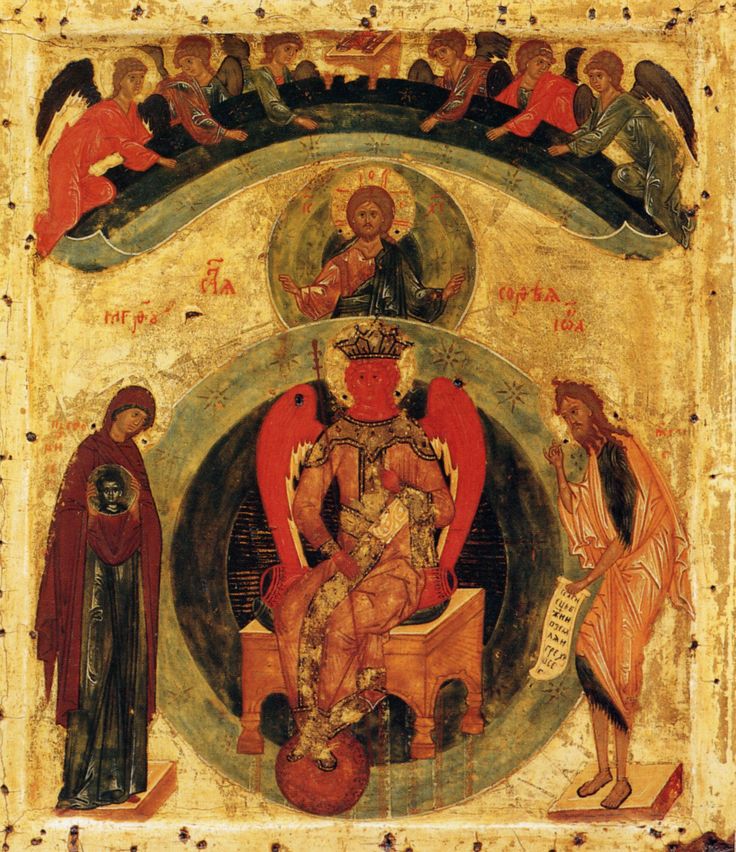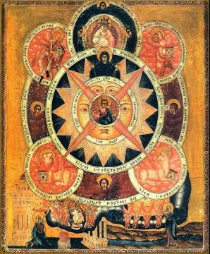 Икона эта находится в Музее Императорской Академии Художеств. На ней изображён круг, концентрически слагающийся из четырёх, различной величины, или трёх кругов. Круг первый, центральный и самый меньший, с четырьмя исходящими из него лучами к краям последнего круга: здесь изображён Иисус Христос Эммануил, благословляющий обеими руками или, скорее, десницей, а в левой держит свиток; кругом головы нимб крещатый с надписью. Лучи, исходящие от круга с Иисусом Христом, кончаются вне большого круга, пред изображениями четырёх евангелистов или их символов.