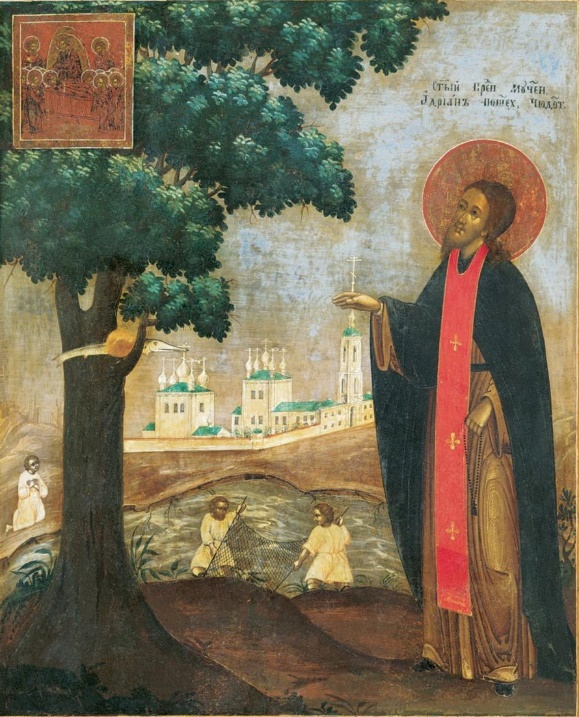 Преподобные старцы прославили Бога и вскоре начали рубить лес, чтобы сделать себе маленькую хижину и затем позаботиться о постройке храма в честь Успения Пресвятой Богородицы. Едва они успели устроить монастырь в 1543 году, как на них было сделано нападение белосельской волости разбойниками, которые, выпытывая от преподобномученика Адриана, где скрыты деньги, жгли его горящею лучиною, кололи ножом и на просьбу его отпустить его в Корнилиев монастырь со злыми насмешками сказали: «Мы здесь наденем на тебя шлем и пустим на небо» – и тут же удавили верёвкой св. старца. В начале XVII века начали совершаться на могиле св. старца чудесные исцеления. По приказанию патриарха Филарета мощи его положены в соборной церкви Пресвятой Богородицы. Замечательною святынею Адрианова монастыря славится чудотворная икона Успения Пресвятой Богородицы, принесённая с собою преподобным мучеником Адрианом.