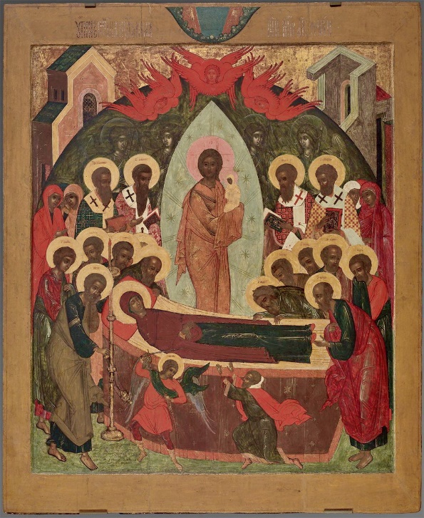 Святая церковь называет Успением кончину Божией Матери, а праздник Успения называется Взятием на небо Пресвятой Богородицы. Из всех икон Успения самая древняя и свято чтимая в России храмовая икона в главном Киево-Печерском храме. Эта икона была чудесным образом передана Пресвятою Богородицею строителям великой лаврской церкви; пред этою иконою много веков молились страждущие и больные и получали утешение и исцеление. С этой чудотворной иконы во всех храмах находятся точные копии, и некоторые из них прославились чудотворениями. После Киево-Печерской из всех икон Успения Божией Матери замечательна икона, писанная на гробовой доске св. митрополита Алексия, и местная икона Успения, писанная митрополитом Московским Петром; она поновлена в 1718 году. Вышиною эта икона 2 аршина 5 вершков, шириною 2 аршина 4 вершка; на ней серебряная вызолоченная риза и золотые венцы с бриллиантами на Спасителе и Богоматери. Святитель Пётр написал подобие с древнейшего образца иконы, принесённой из Константинополя в Киев, по особенному усмотрению Провидения. На этой иконе внизу изображено пречистое тело Пресвятой Богородицы, по отшествии души Её, почивающее на одре. Собор апостолов поднимает одр и несёт его к месту погребения; св. апостол Пётр воздаёт ему честь каждением фимиама. Вверху, над смертным одром и над бездыханным телом Пресвятой Девы, икона представляет Самого Христа Спасителя, держащего на руках душу Её, в образе младенческом, что означает начатие новой жизни на небесах. Небесные силы сопровождают чистую душу Матери Божией и с благоговейным страхом взывают: «Радуйся, Благодатная, Господь с Тобою». Небесные Силы так прославляют Царицу Небесную, а православный мир, здесь на земле, не перестаёт взывать к Ней: «Пресвятая Богородица, помогай нам!»