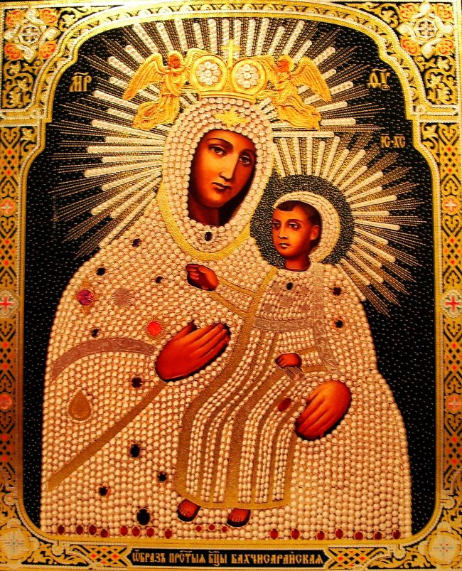 «На скале в горе чудотворне изображена и до днесь водою из-под образа многие исцеляются» – так указано о Крымской иконе в Агиологии89 Востока архимандрита Сергия. В Мариуполь перенесена эта чудотворная икона из Крыма при переселении греков в 1779 году, а прежде находилась в Бахчисарае, где прославилась в древности. Об этой иконе сохранилось народное предание, записанное писателями