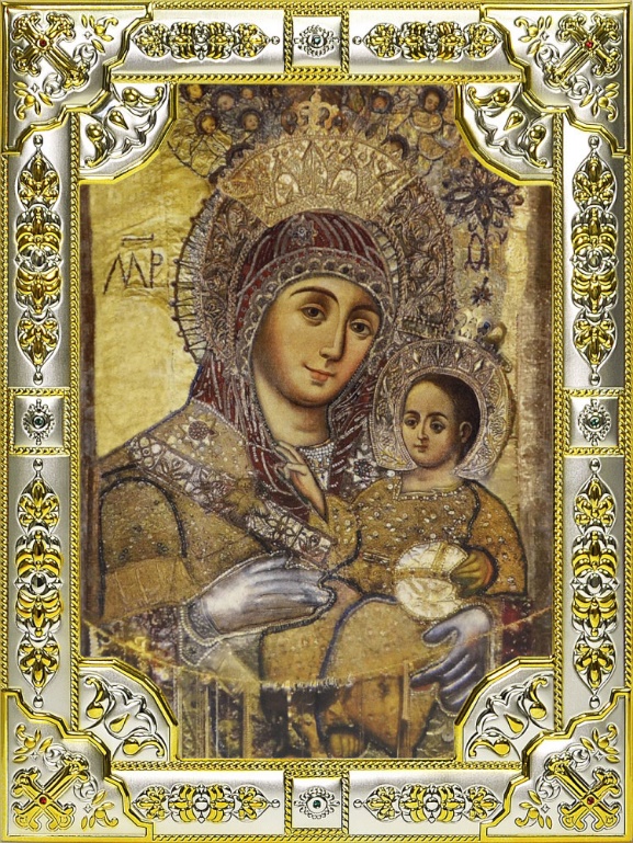 Сия чудотворная икона поставлена была в X веке великим князем Владимиром в церкви Десятинной и находилась там более 500 лет. Около 1500 года при разграблении Киева татарами икона, по снятии с неё дорогих украшений, брошена была татарином в Днепр. Спустя несколько времени икона явилась в Пинске на р. Свислочи, где жители нашли её, увидав необычайное сияние от неё. Она была поставлена в церкви замка 13 августа 1500 г. и находилась там 116 лет. Оттуда в 1616 году перенесена в минскую церковь Святого Духа, где и поныне сияет, являя над многими из верных чудеса благодати Божией. В 1635 году митрополит Рутский приказал перенести сию икону из православной соборной церкви в Вознесенский монастырь, обращённый из православного в унию. Но теперь икона по-прежнему находится в минском православном соборе. Она помещается с левой стороны иконостаса. Вышина её 2 аршина, а ширина 1 аршин 51/2 вершков; писана яичными красками на деревянной доске. В 1852 г. усердием православных св. икона покрыта серебряною ризою. Над ликами Богоматери и Предвечного Младенца, держащего державу, находятся серебряные вызолоченные венцы – короны с бриллиантами; внизу на ризе вычеканена надпись, изображающая историю иконы.
