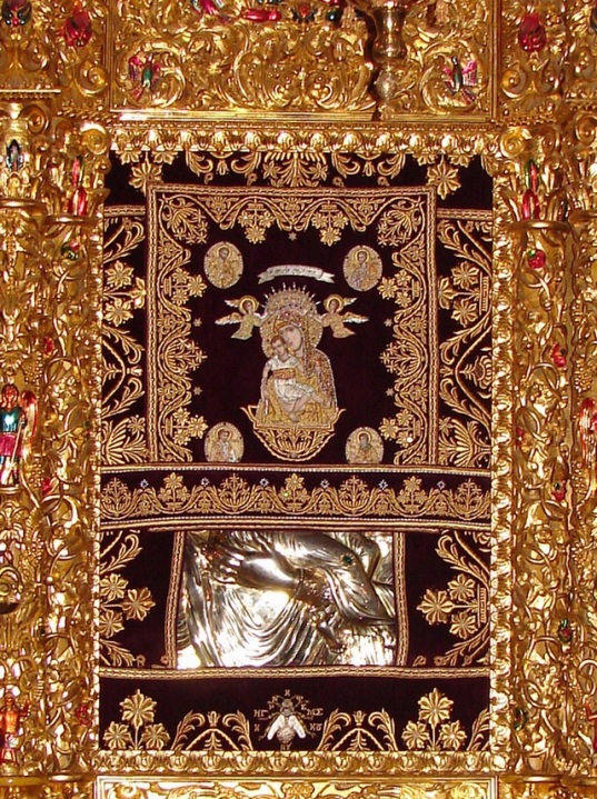 Большая и наилучшая часть этих драгоценностей составляет жертву в Бозе почивших императриц Александры Феодоровны и Марии Александровны и великих княгинь Александры Иосифовны, Марии и Ольги Николаевн; эти жертвы украшают убрус на главе Богоматери и перси, а также грудь, пояс и прочие части одежды у Спасителя. Из них особенно замечательны: 1) бриллиантовое ожерелье на шее Богоматери; 2) две большие бирюзы, осыпанные бриллиантами на груди Её; самая большая бирюза по наследству от королевы прусской Шарлотты перешла в собственность императрицы Александры Феодоровны и составляла любимое для неё украшение; 3) бриллианты на поясе и по одежде у Спасителя; 4) большой изумруд в венце Спасителя, пожертвованный императрицею Александрою Феодоровною на память графини А. А. Орловой-Чесменской; 5) рубин розовый; 6) армантин на убрусе Богородицы; 7) зелёные аквамарины на поясе у Спасителя; 8) разные эмалированные вещи с бурмицкими зёрнами; 9) золотые вещи с каменьями и 10) жемчужный браслет.
