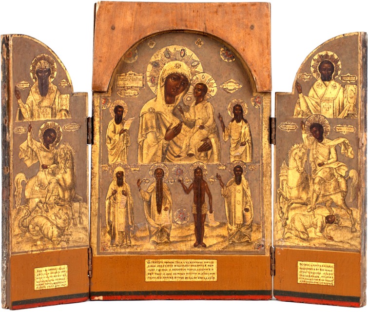 Сия чудотворная икона была келейною собственностью основателя общежительного Новорусского Андреевского скита, первого игумена Виссариона, и поднесена им в дар и благословение братству сего скита при открытии оного в 1849 году 11 октября. Мера иконы 91/4 вершков вышины, 7 вершков ширины; она составляет собою створчатые складни, на дверках которых изображены: св. великомученики Георгий и Димитрий Солунский на конях; святители Спиридон Тримифунтский и Николай Мирликийский, чудотворцы. На самой иконе внизу изображены св. Антоний Великий, Евфимий Великий, Савва Освященный и преподобный Онуфрий, а по сторонам Божией Матери – св. Иоанн Предтеча и св. апостол и евангелист Иоанн Богослов. В этой иконе хранятся частицы св. мощей: первомученика архидиакона Стефана, преподобного Григория Синаита, преподобномученика Михаила; из числа избиенных в обители св. Саввы Освященного – новых преподобномучеников Игнатия, Евфимия и Акакия Афонских. Замечательное византийское письмо и все иконографические черты указывают на многовековую древность этой иконы.