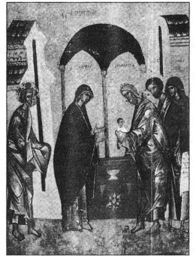 В это время пришёл в храм, по внушению Духа Святого, старец Симеон и, приблизившись к благодатной Марии, принял из Её рук Новорождённого, почему и называется Богоприимцем. Прославив Бога, старец в священном восторге произнёс пророчественную песнь о Спасителе мира: «Ныне отпущаеши раба Твоего, Владыко, по глаголу Твоему с миром, яко видеста очи мои спасение Твое, еже еси уготовал пред лицем всех людий: свет во откровение языков и славу людей Твоих Израиля».