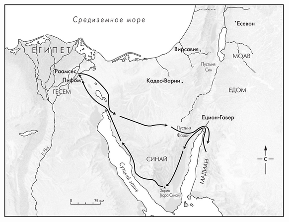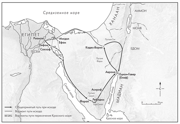 Исход начался из Раамсеса. О его точном местонахождении нет единого мнения, однако наиболее вероятным представляется современный Кантир (Тель-эль-Даба). Отсюда евреи отправились на юг до Сокхофа (13,20), а затем повернули на север (14,2). Здесь упоминаются три места: Ваал-Цефон, Мигдол и Пи-Гахироф. Ваал-Цефон отождествляется с Тифаном, расположенным на берегу озера Манзала одного из соленых озер между Средиземным морем и Суэцким заливом. Существует три вероятных маршрута бегства израильтян. «Путь по земле филистимской» связывал Египет с Ханааном хорошо укрепленной дорогой вдоль берега. Второй путь по пустыне Сур начинался неподалеку от Вади-Тумилат в районе дельты, пересекал Кадес-Варни и далее шел к Ханаану. Египетская пограничная стена в пустыне Сур была, вероятно, главным препятствием на этом пути. Господь же повел Свой народ на самый юг Синайского полуострова и не только привел их к горе, которую Он предназначил для общения с Моисеем, но и избавил израильтян от дальнейшего преследования египтянами. Чудесный переход через море, по всей вероятности, произошел в районе южного берега озера Манзала.