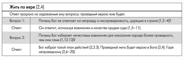 праведный своею верою жив будет. Это слово утешения и поддержки для Аввакума и остатка верных Богу. Господь обещает, что в стране, которая переполнена злом (1,2–4) и на которую направлен Его гнев, сохранятся праведные, которые верою в Того, Кто во гневе помнит о милости (3,2), вступят на путь, ведущий к жизни. В Быт. 15,6 Господь обещает дать жизнь омертвелому телу Сарры и она сможет иметь детей. В откровении Аввакуму Господь обещает жизнь (и победу) праведникам из омертвелого (отпавшего от Бога) еврейского народа, так же, как Он дал жизнь и победу народу Израиля, выведя его из рабства (3,13–19). Как Авраам с верою терпеливо ждал исполнения Богом обещанного (Евр. 6,15), так и Аввакум и остаток верных Господу должны терпеливо ждать исполнения обетовании Божиих (ст. 3; 3,16).