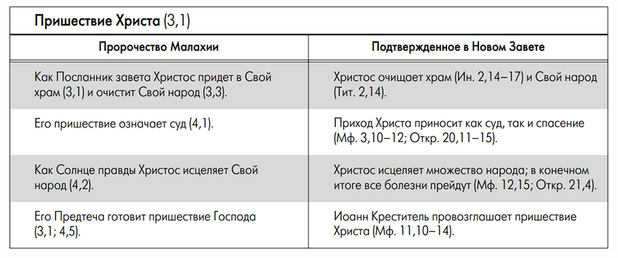 Ангел завета. В ответ на заявление, что Бог будто бы не проводит различия между добром и злом (2,17), здесь указывается на исправляющее и очищающее служение Ангела завета. На выпад: «где Бог правосудия?» (2,17), ответ дается в ст. 5. Иудеи ожидали, что Бог будет судить другие народы, но Господь говорит: «приду к вам для суда» (ст. 5). «Ангел завета» означает иное лицо, нежели «ангел Мой», потому что Он исправит и очистит священников, левитов, равно как и все царство. Он изменит укоренившуюся у народа практику жертвоприношений и свершит преобразование самого священства (ст. 2–5). Одним словом, сей «Ангел завета» есть Мессия. Это пророчество исполняется в Иисусе.