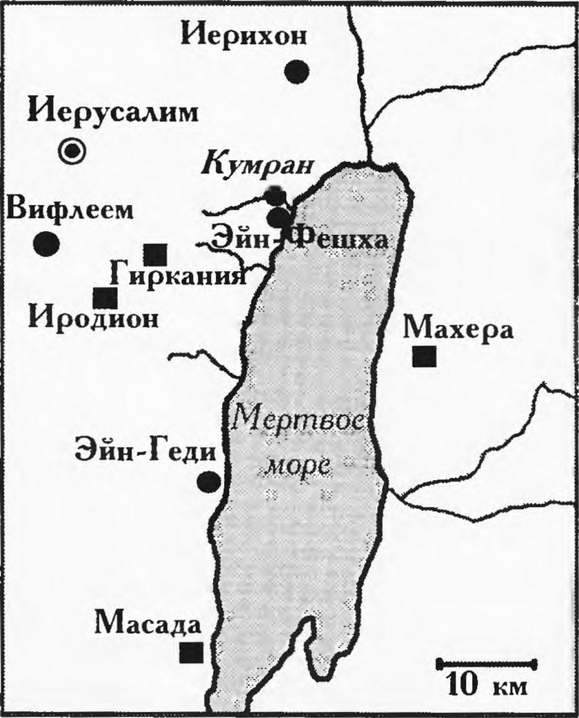 Основным аргументом в пользу кумрано-ессейской теории с момента её возникновения и до сих пор считается ссылка на описание поселения ессеев у Плиния Старшего. В «Естественной истории» (V, 17, 73) он пишет: «к западу [от Асфальтового озера – т.е. Мёртвого моря] <...> проживают ессеи»95. Из приведённой карты (рис. 2.2)96 видно, что, хотя Кумран и находится на западе от Мёртвого моря, его расположение лучше было бы охарактеризовать как к «северо-западу» или даже «к северу». По образному выражению Яна Хатчесона (Ian Hutchesson), если Плиний Старший, говоря о месте поселения ессеев, имел в виду именно Кумран, а не другое место, то указание «к западу» было бы весьма неточным: это было бы такой же ошибкой, как утверждение, что «Норвегия находится на западе Европы». По мнению Я. Хатчесона, более логично предположить, что Плиний указывал на Эйн-Геди как место обитания ессеев, ведь «Эйн-Геди, который действительно рядом с западным берегом, <...> доступен с дороги, ведущей от него на восток97.