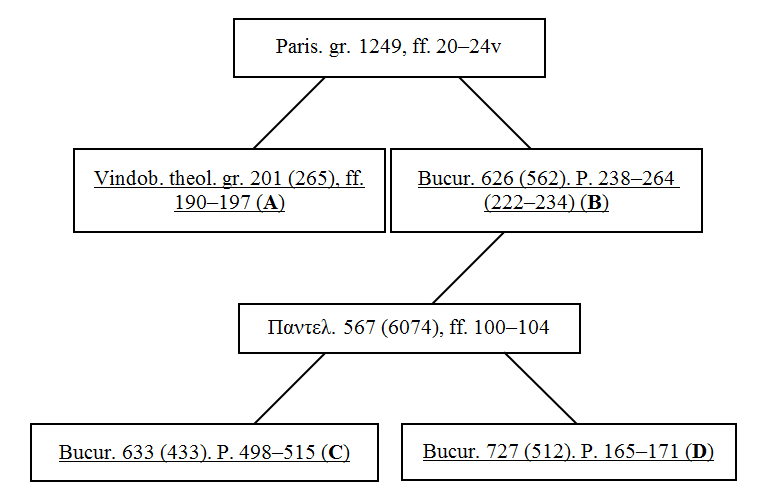 Paris. gr. 1249, ff. 20–24v; Vindob. theol. gr. 201 (265), ff. 190–197; Baroc. gr. 193, ff. 82v–86v; Ἀθηνῶν, Ἐθν. Βιβλ. 2583, ff. 161–167; Γυμν. Μυτιλ. 6, ff. 158v–161v; Παντελ. 179 (5686), ff. 108–112v; Taurin. gr. 316, ff. 41–47; Bucur. 626 (562). Р. 238–264 (222–234); Κων/πόλεως ΜΠΤ 352, ff. 2v–8; Παντελ. 567 (6074), ff. 100–104; Bucur. 633 (433). Р. 498–515; Bucur. 727 (512). Р. 165–171; Χάλκης 48, ff. 109–113v.