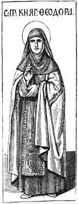 Дочь Тверского боярина Анастасия (Васса) Ивановна ещё в юных летах любила читать назидательные книги и желала посвятить себя Богу. Ей было немного более 12 лет, когда благочестивый князь Андрей Константинович Нижегородский просил у родителей её руки её, и в исполнение воли родителей вступила она в супружество. – Ни почести, ни богатство не увлекли за собой души её. – Под богатой одеждой носила она тело строгой постницы и часто пребывала в молитве. Князь Андрей был кроткий, набожный, добродетельный, и после 13 лет супружеской, но бездетной, жизни скончался иноком218. Княгиня его пробыла ещё в миру вдовой 4 года. Потом, даровав свободу всем слугам, раздав богатство церквам и нищим, на 40 году своей жизни вступила в Зачатьевский монастырь, построенный ею ещё при жизни супруга, на берегу р. Волги, при подошве Нижегородского Кремля. – Преподобный Дионисий, впоследствии архиепископ Суздальский, постриг её в иночество с именем Феодоры. В иночестве увеличила она строгость к себе: пребывала без пищи день, иногда два, а иногда и пять дней; ночи проводила в слёзных молитвах; пропитание себе приобретала трудами рук своих. На теле её была власяница без рубашки. «Если царь, говорил опытный подвижник, захочет взять неприятельский город, то прежде всего удерживает воду и съестные припасы, и неприятель, истомись от голода и жажды, сдаётся. Так бывает и с плотскими страстями. Если человек пребывает в посте, враги, ослабев, оставляют душу»219. Так и поступала с собою блаж. Феодора. Но она старалась ещё обучать себя смирению и любви. Как бы ни оскорбляли её и кто бы ни оскорблял, она переносила всё незлобиво. Пример её строгой жизни увлекал за собой других: княгини и боярыни вступали в обитель Зачатиевскую, и до 100 дев и вдовиц под её наблюдением жили в обители по уставу общежития. Княгиня подвижница скончалась 47 лет в 1378 году220.