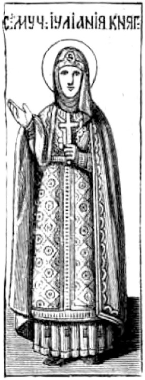 Блаженная княгиня Иулиания – образец высокого супружеского целомудрия338. Супруг её князь Симеон Мстиславич – (Иванович) Вяземский разделил несчастную долю Смоленского князя Юрия Святославича. – Когда Витовт завладел Смоленском, захватив в нём в плен и супругу Юрия, Симсон последовал за Юрием в Новгород. В. кн. Василий Дмитриевич, которого брат Юрий женат был на дочери несчастного Смоленского князя, дал изгнанным князьям Торжок. – Супруга кн. Симеона цвела телесной красотой, а ещё более душевной. Сластолюбивый Юрий, разжигаемый похотью скотской, не раз хотел осквернить её. – То словами строгой правды, то мольбой удерживала она несчастного от греха. – «Нельзя быть тому: у меня есть муж и я дорожу верностью ему более, чем жизнью», говорила целомудренная княгиня Юрия. Князь решился на явное злодеяние в своём доме. Среди весёлого пира, убил князя Симеона. Затем хотел он безнаказанным насилием насытить скотскую похоть свою. Чтобы отрезвить его и легче уйти, княгиня ударила рассвирепевшего в плечо ножом. Юрий с мечем в руке догнал ушедшую Иулианию на дворе, изрубил её и велел бросить в реку. Это было 21 декабря 1406 г. Гнусный убийца убежал к Татарам, но, не найдя там покоя от мучений совести, удалился в Рязанскую пустынь, где в горьком раскаянии окончил жизнь в 1408 г.339.