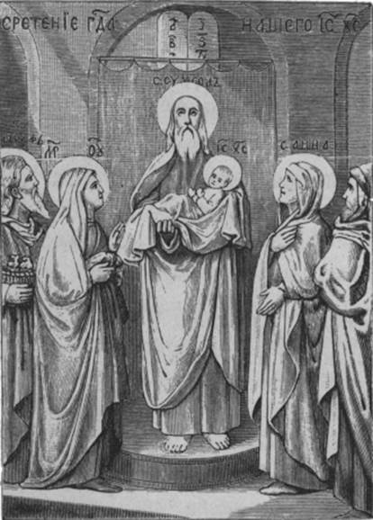 Тогда жил в Иерусалиме праведный и благочестивый старец Симеон, чая утехи Израилевы: и Дух бе Свят о нем (Лук.2:25). Ему обещано было, что он не умрет, не увидев Христа Господня. По внушению Духа Божия, Симеон пришел во храм в то время, когда родители принесли Младенца Иисуса, чтобы поставить его пред Господем; принял Богомладенца на руки, почему и называется Богоприимцем; благословил Бога и изрек пророчественную песнь о Спасителе: ныне отпущаеши раба Твоего, Владыко, по глаголу Твоему с миром: яко видесте очи мои спасение Твое, еже еси уготовал пред лицем всех людей: Свет во откровение языком, и славу людей Твоих Израиля (Лк.2:29–32). Иосиф и Матерь Божия дивились сказанному. Симеон благословил и их и продолжал пророчествовать о Младенце: се лежит Сей на падение и на востание многим во Израили. И тебе же самой, св. старец предрек Богоматери, душу пройдет оружие, да от многих сердец откроются помышления (Лк.2:34–35).