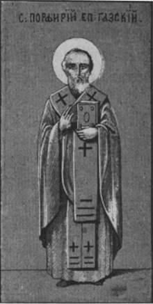 С постом и молитвою приступил митрополит к избранию достойного епископа и Господь внушил ему призвать Иерусалимского священника Порфирия. Со страхом и трепетом принял смиренный пресвитер свое новое назначение, искренно сознавая себя недостойным такого высокого сана и надеясь исключительно только на помощь Божию. – Со слезами поклонился он еще раз Иерусалимской святыне и Животворящему Кресту и, передав патриарху ключи от ковчега, в котором хранилась часть Животворящего Древа, отправился в Кесарию с своими учениками Марком и Варухом. Одну ночь во время пути провели они в Лидде, где покоятся мощи св. великомученика Георгия, и вскоре достигли г. Газы, где и поселились в епископском доме. Жители Газы были, большею частию, грубые язычники, ненавидевшие христиан. Узнав о скором прибытии нового епископа, они обставили путь его всякими препятствиями, набросали по дороге терну, наделали ям, одним словом, еще не видав его, уже заявили себя враждебно. Христиан же в городе было не более трех-сот.