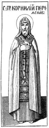 Пр. Корнилий, в мире Конон273, сын Рязанского купца, в юных летах скрылся из дома родительского и в Лукияновой пустыне, в 25 вер. от Переяславля, прожил 5 лет у старца Павла. Потом пришёл в Переяславскую обитель св. Бориса и Глеба, что на песках; здесь было тогда только три монаха и строитель Сергий; монастырь был самый бедный. Конона долго не соглашался принять Сергий, потому что он был ещё молод, – по виду полагали ему «не более 15 лет», – к тому же он ничего не говорил о себе; но терпение Конона довело его до цели. Он не отходил от ворот обители, и его приняли в обитель, признав его глухим и немым. Конон усердно ходил в храм и усердно трудился по послушанию, – молол рожь, носил дрова в трапезу хлебную, таскал воду, – делал всё, что приказывали; а в трапезе не садился с старцами, но после всех довольствовался тем, что оставалось; к тому же принимал пищу только три раза в неделю. Так прожил он 5 лет и по просьбе его пострижен был в иночество. С того времени никто не видал его спавшим на постели, а послушания по-прежнему выполнял он с полным усердием. Число братии уже увеличилось в обители, и некоторые смеялись над Корнилием, как над юродивым; он терпел и молчал. Спустя три года просил он у строителя дозволения жить в затворе. Строитель, видя подвижническую жизнь его, выстроил ему келийцу и благословил жить в ней. Корнилий затворился и безвыходно подвизался в посте и молитвах. Но раз нашли его у кельи едва живым, – келья была заперта изнутри и отворено было только оконце. – Корнилий пролежал больным три месяца с и ничего не ел, а принимал только воду и сок. Выздоровев, остался он, по убеждению настоятеля, жить с братией, усердно ходил в храм, исправлял должность пономаря, служил в трапезе, – копал землю, садил овощи и плодовые деревья. В саду его росли превосходные яблоки, и он с любовью раздавал их безденежно. Строгий пост и подвиги так иссушили его, что он походил на сухое дерево; и однако не переставал трудиться. – Своими руками выкопал для братии колодезь, и вода колодезя его была весьма вкусная и чистая. Он не прерывал молчания своего и теперь, когда жил с братиями. Так прожил он 30 лет, оставаясь во мнении других глухим и немым. Перед кончиной, о которой дал он знать знаками, пошёл он к общему духовному отцу, игумену Никольской обители Варлааму, исповедался, причастился св. Таин и по просьбе его облечён был в схиму; только теперь, по просьбе духовника, рассказал о себе, кто он, откуда, как шла жизнь его. Возвратясь в обитель, особоровался св. маслом и в тот же день скончался. Это было 22 июля 1693 г. Он был похоронен в часовне, вблизи первоначального схимника Адриана убиенного. Спустя 9 лет, при построении нового храма, обретены были нетленные мощи его. При освящении храма в честь Смоленской иконы Богоматери в 1705 г. святитель Димитрий Ростовский, в ведении которого стоял тогда Переяславль, свидетельствовал мощи, и они положены были в новом храме, под спудом. Святитель написал тропарь и кондак преподобному; тогда же написана была икона преподобного. – В ркп. житии записано всего 17 чудес, совершившихся при мощах преподобного до июля 1717 г.; имя его внесено и в ркп. святцы. – Икона его с надписью: «образ пр. Корнилия, Переславского чудотворца».