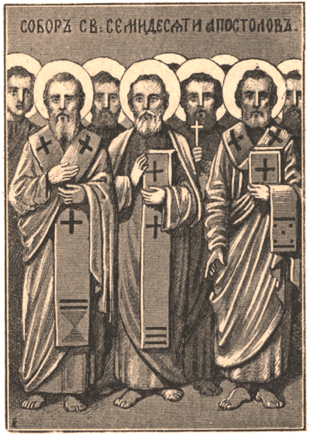 Кроме 12, Господь Иисус Христос избрал ещё 70 и посылал их пред Собою по городам и весям проповедовать Евангелие Царствия Божия (Лк.10). По сошествии Св. Духа они проповедовали в разных странах, и некоторые сопутствовали Апостолам из 12, как например Марк и Лука Евангелисты. В церковном праздновании в лике семидесяти прославляются и некоторые из неизбранных Господом непосредственно, но потрудившихся апостольски. День собора в честь 70 Апостолов установлено без сомнения с тем же благочестивым намерением, с каким и день в честь собора 12, т. е. ради равночестия каждого из 70 Апостолов и для предохранения верующих от разногласия – в почитании их. Всех их вместе и равночестно прославляет Сам Господь, говоря: радуйтеся, яко имена ваша написана суть на небесех, и всех их назвал блаженными (Лк.10:20, 23). Апостолы из лика 70 прославляются Православной Церковью в следующем порядке: